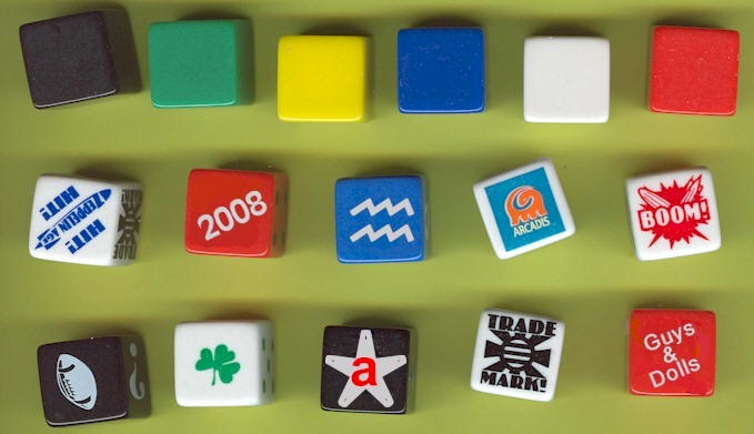 | Set-Up Charge: $30 (G) per color Standard Imprint Colors: Red, Black, Blue, Green, White, Silver PMSTM Color Match: $30 (G) per color Dice Color: Red w/ White, White w/ Black, Blue w/ White, Green w/ White, Black w/ White, White w/ multi-colored spots (Dark Blue, Light Blue, Green, Red, Orange, & Yellow) Imprint area: Please Inquire |