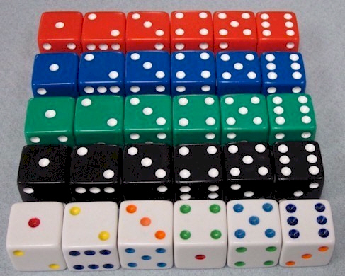| Standard Imprint Colors: Red, Black, Blue, Green, White, Silver PMSTM Color Match: $30 (G) per color Dice Color: White with Black only Imprint area: 5/8" x 5/8" Packaging: Standard: Bulk Polybagged |
