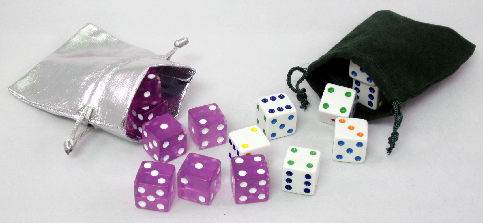 We carry 4 different varieties of Dice. All dice are available packaged in optional draw string bags (Silver or Green).