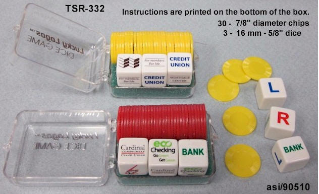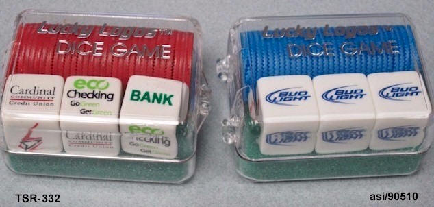 Your client is certain to be the winner with the new, mega-fun Lucky LogosTM Dice Game. It is fast paced, very simple to play and players try to roll "Logos" to win. Your client's logo will appear 9 times, 3 on each die.
