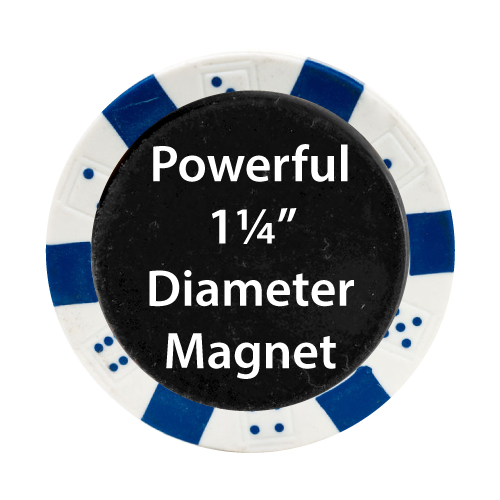 We offer 6 different varieties of magnetic poker chips. All prints are directly on chips, no stickers. Print is on side 1 and a powerful 1-1/4" diameter magnet on side 2.