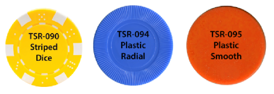 | TSR-094 | Plastic, Radial | 1-5/8" Diameter x 1/8" Thick | .8" | Yellow, Maroon, Orange, Dark Blue, Light Blue, Pink, White, Green, Gray, Red, Purple, Black |