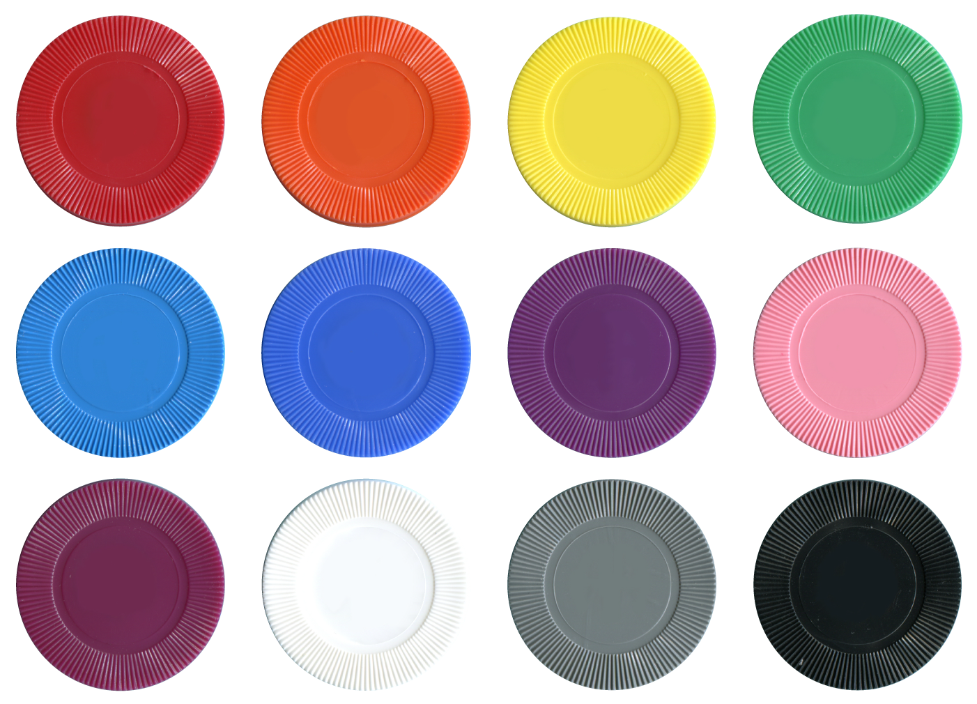 Chips of differing colors but same design may be assorted in increments of 100 pieces only, for better quantity pricing.